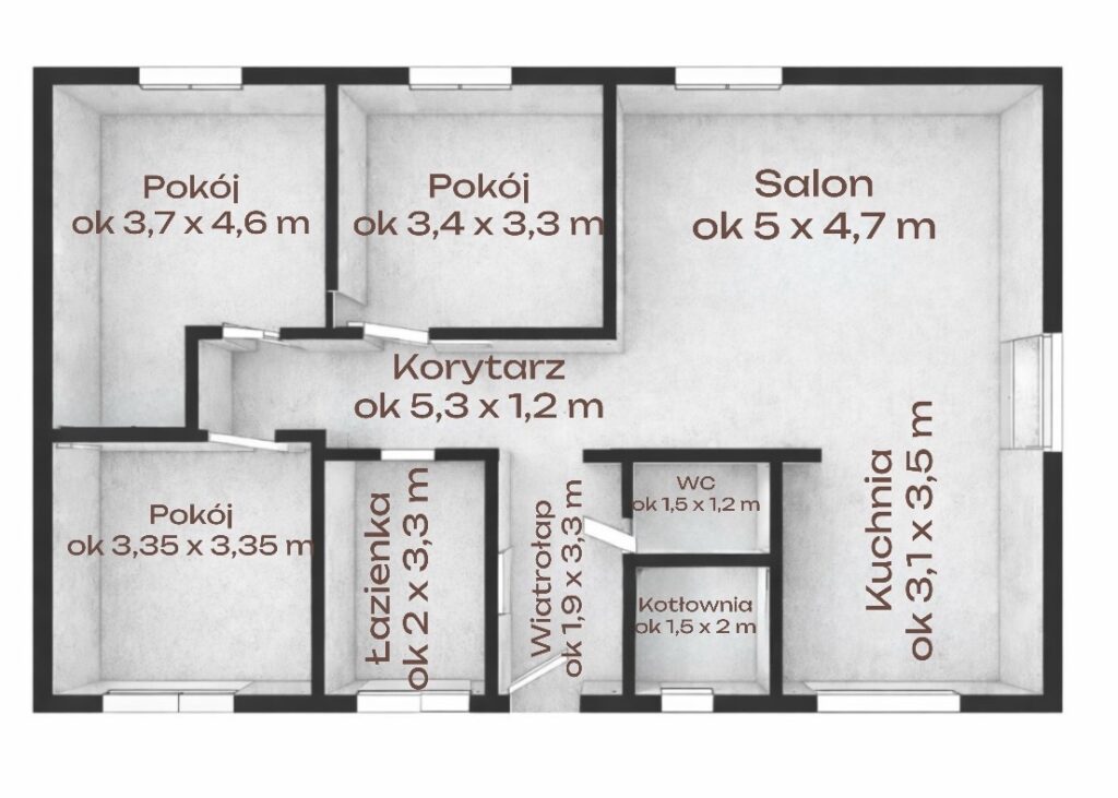 Dom sprzedawany jest w stanie deweloperskim, gotowy do wykończenia według własnych potrzeb i gustu.